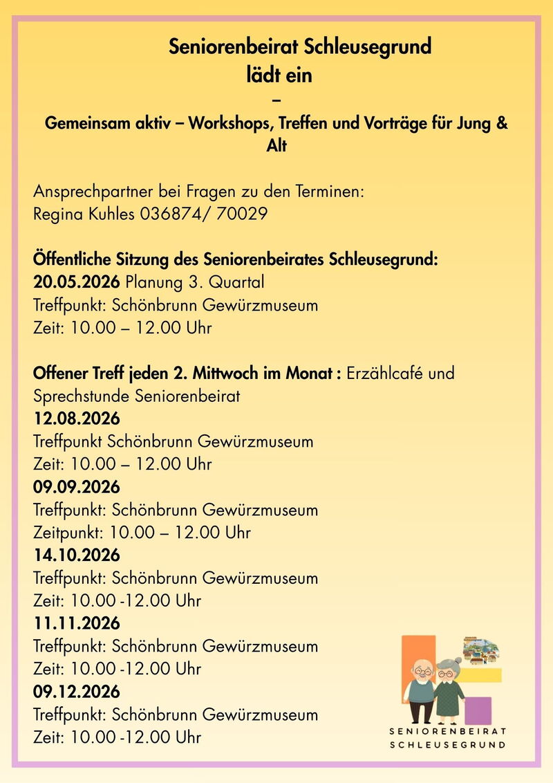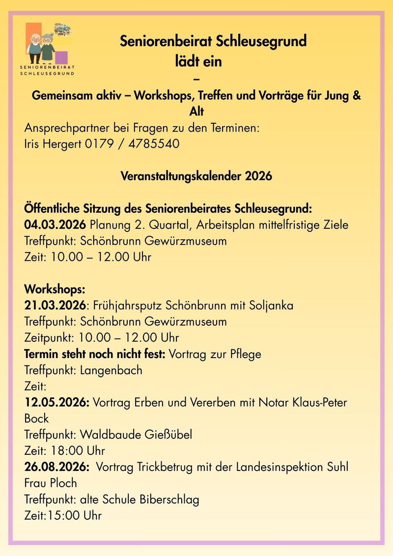Die Gemeinde Schleusegrund hat einen Seniorenbeirat. Dieser wurde in der Gemeinderatssitzung am 08.12.2025 von den Gemeinderäten gewählt.